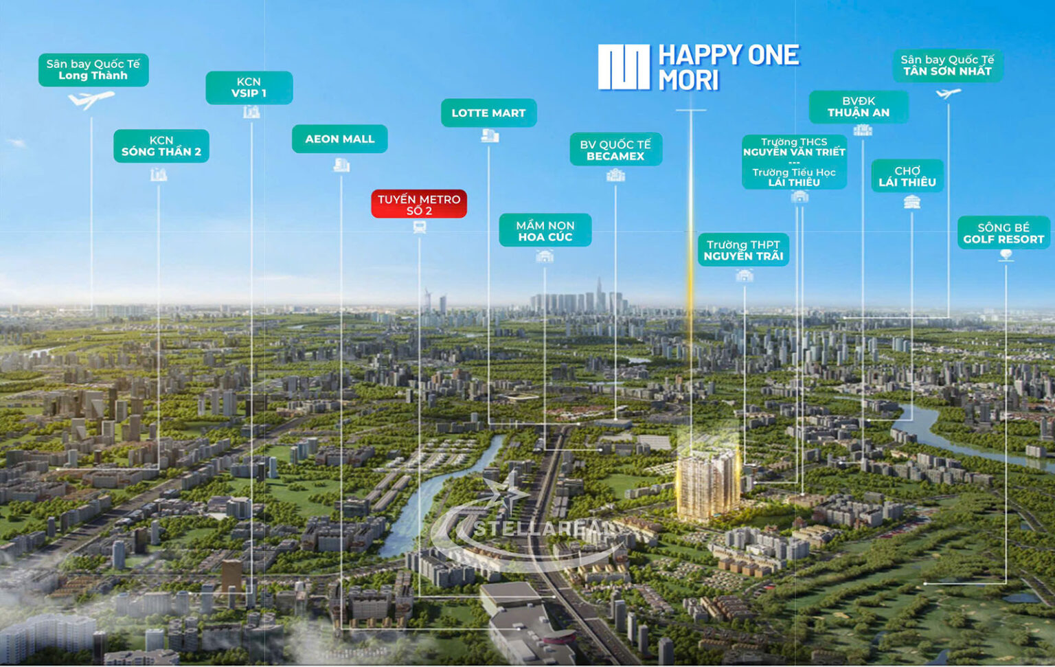 Từ Happy One Mori, cư dân chỉ mất vài phút di chuyển để tiếp cận toàn bộ hệ sinh thái tiện ích ngoại khu hoàn thiện bậc nhất Bình Dương – nơi mọi nhu cầu sống, làm việc và giải trí đều nằm trong tầm tay: