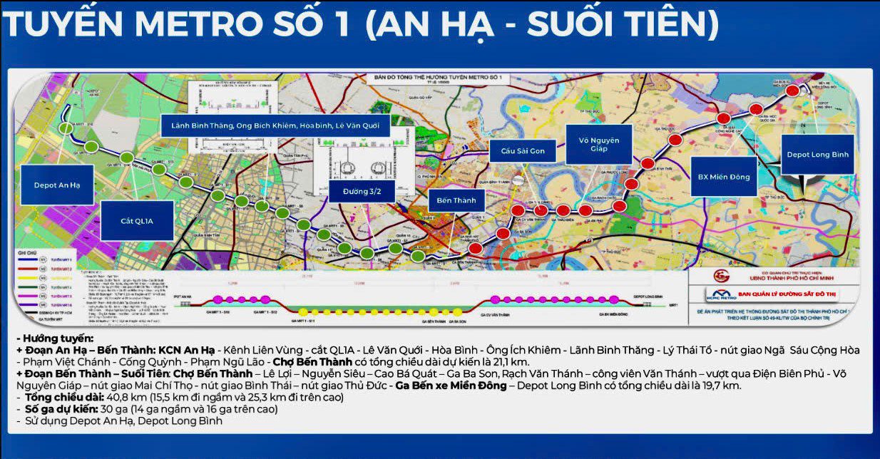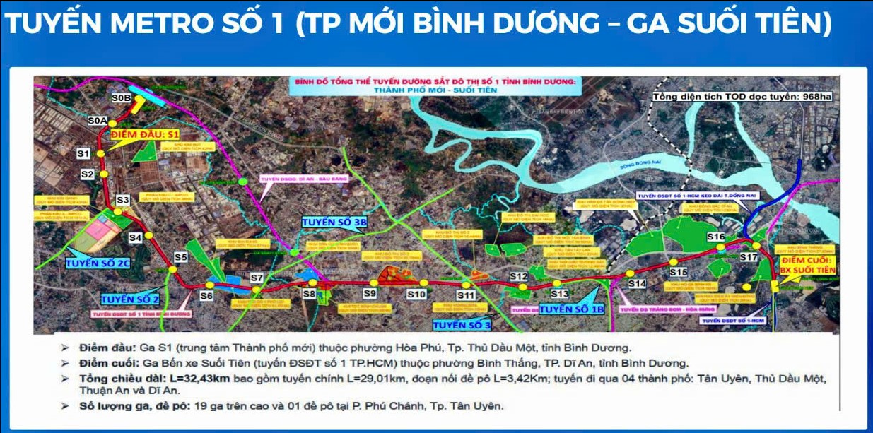 Tuyến metro số 1 (Thành phố mới Bình Dương – Suối Tiên) có tổng chiều dài 32,43km, bao gồm tuyến chính 29,01km toàn bộ đi trên cao và đoạn nối depot 3,42km. Tổng mức đầu tư dự kiến 2,27 tỉ USD. Ngày 16-8, UBND TP.HCM đã có quyết định giao Ban Quản lý đường sắt đô thị làm chủ đầu tư, triển khai công tác chuẩn bị đầu tư tuyến metro này.