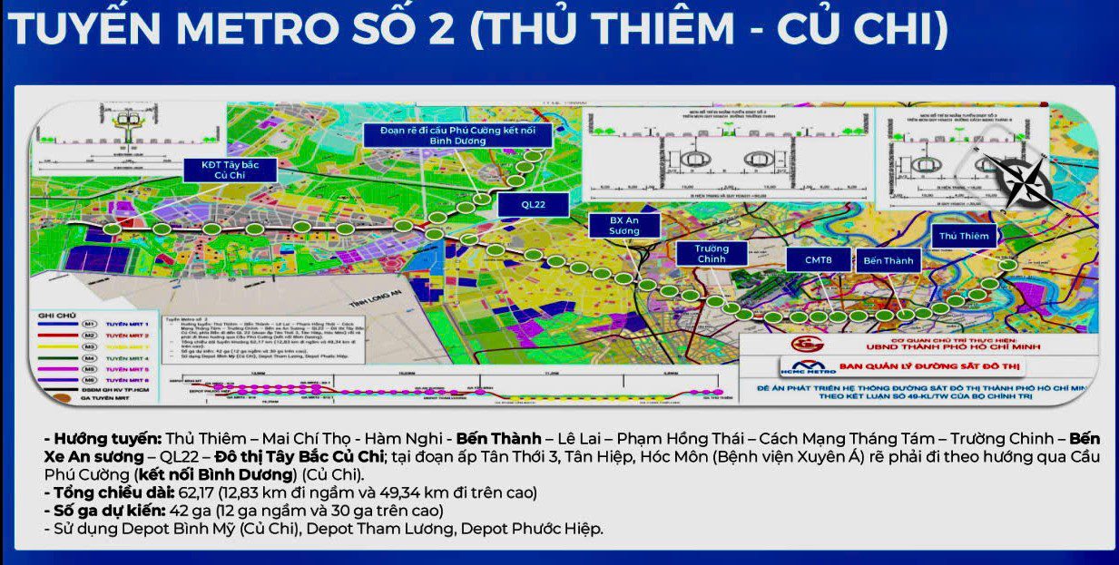 Tuyến metro số 2 (Thủ Thiêm – Củ Chi) có tổng chiều dài 62,17 km, bao gồm 12,83 km đi ngầm và 49,34 km đi trên cao, dự kiến có 42 nhà ga, gồm 12 ga ngầm và 30 ga trên cao. Tổng vốn ước tính sơ bộ 2,77 tỉ USD.