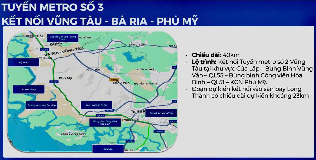 Tuyến metro số 3 Vũng Tàu- Bà Rịa-Phú Mỹ, tuyến này dài 63 km, có tính tới đoạn kết nối sân bay Long Thành khoảng 23km (chiều dài theo quy hoạch trước đây 40km). Tổng mức đầu tư dự kiến 4,83 tỉ USD.